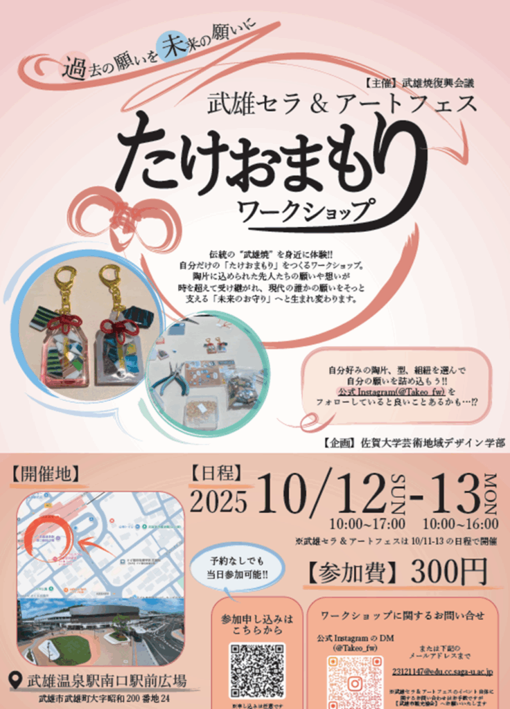 佐賀県武雄市の伝統工芸「武雄焼」をテーマにした体験型ワークショップ『未来へつなぐ たけおまもり』を開催いたします。本ワークショップでは、かつて人々の願いや祈りが込められた“陶片”に着想を得て、参加者が思い思いの願いを込めたオリジナルのお守り「たけおまもり」を制作します。先人たちの想いが込められた陶器のかけらが、時を超え、現代を生きる人々の願いをそっと支える“未来のお守り”として新たな命を吹き込まれる体験です。
